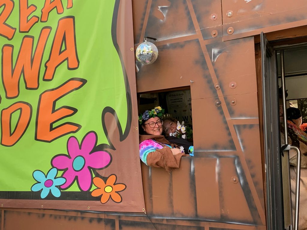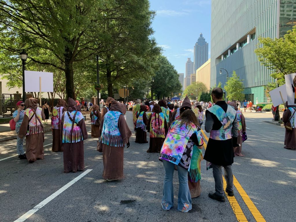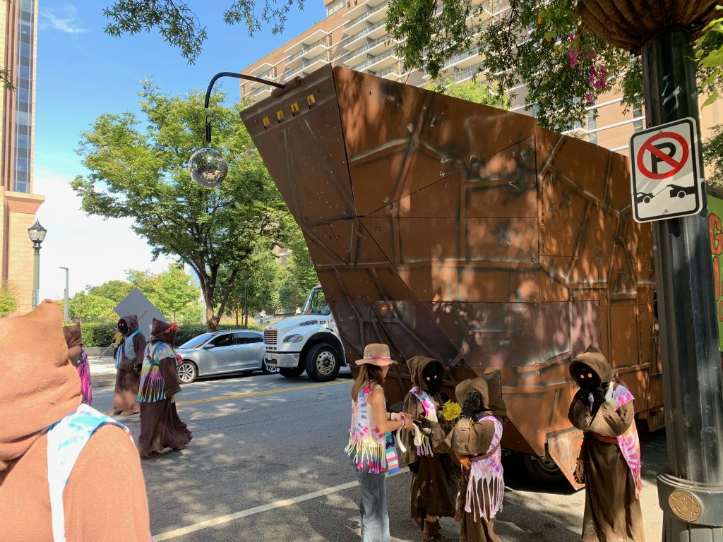For the DragonCon 2024 parade the Great Jawa Horde took inspiration from the 60's and 70's. Our sandcrawler sported groovy side art and a disco ball while the Jawas had tie-dyed vests and lots of big flowers!