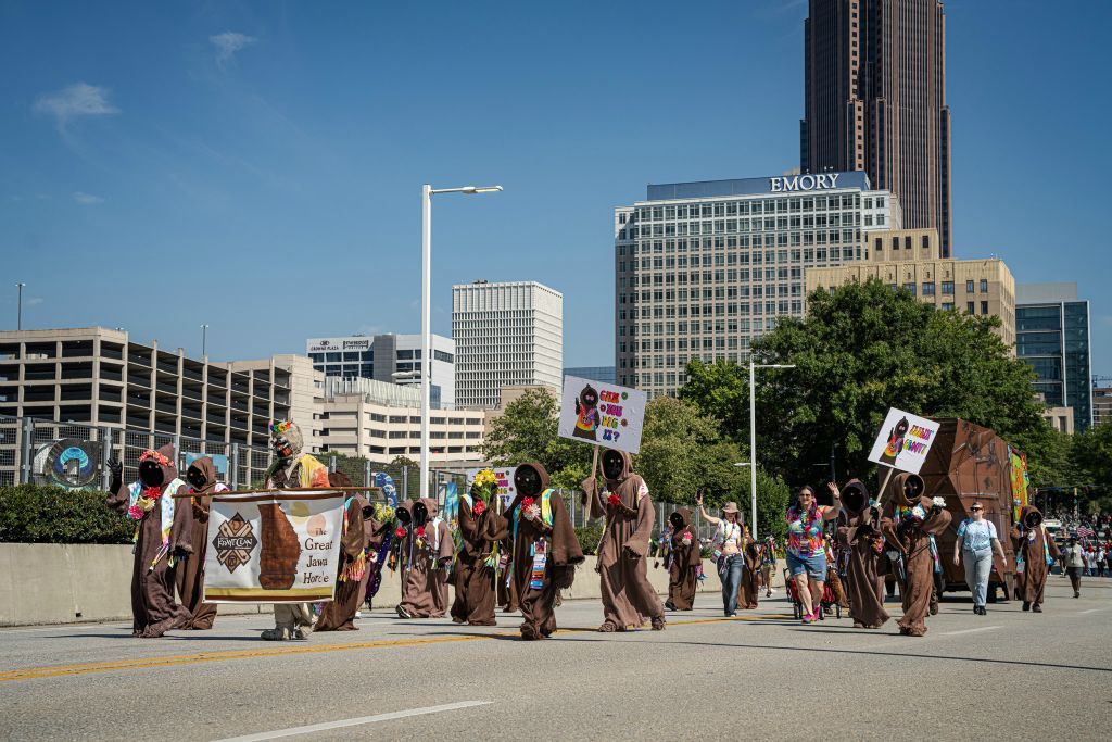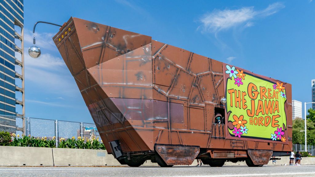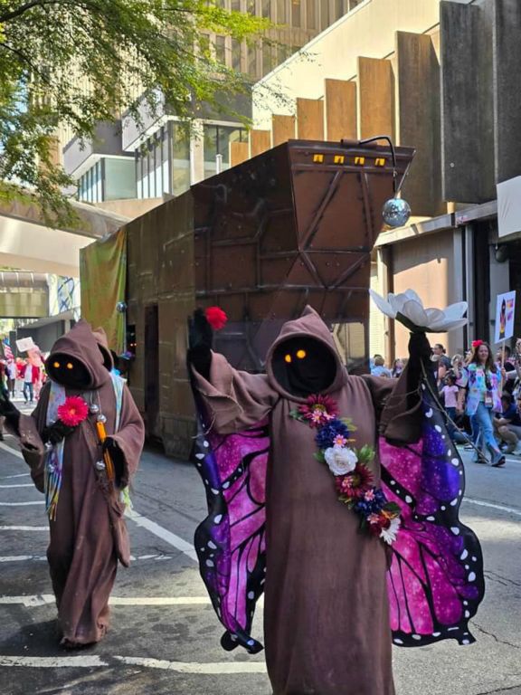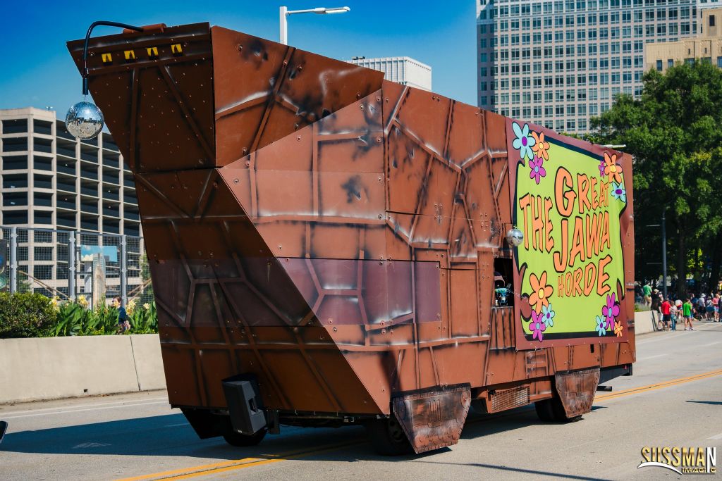 For the DragonCon 2024 parade the Great Jawa Horde took inspiration from the 60's and 70's. Our sandcrawler sported groovy side art and a disco ball while the Jawas had tie-dyed vests and lots of big flowers!